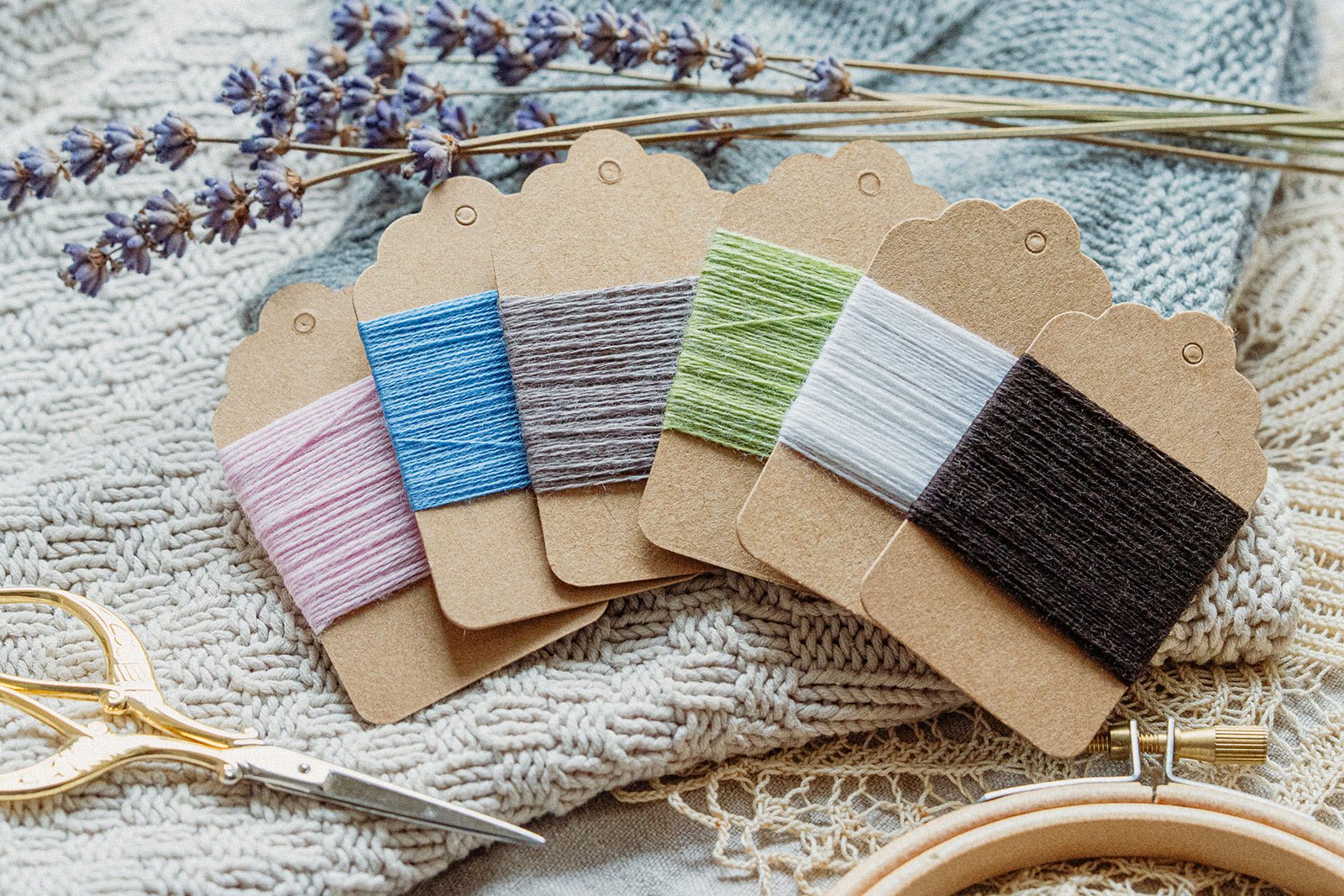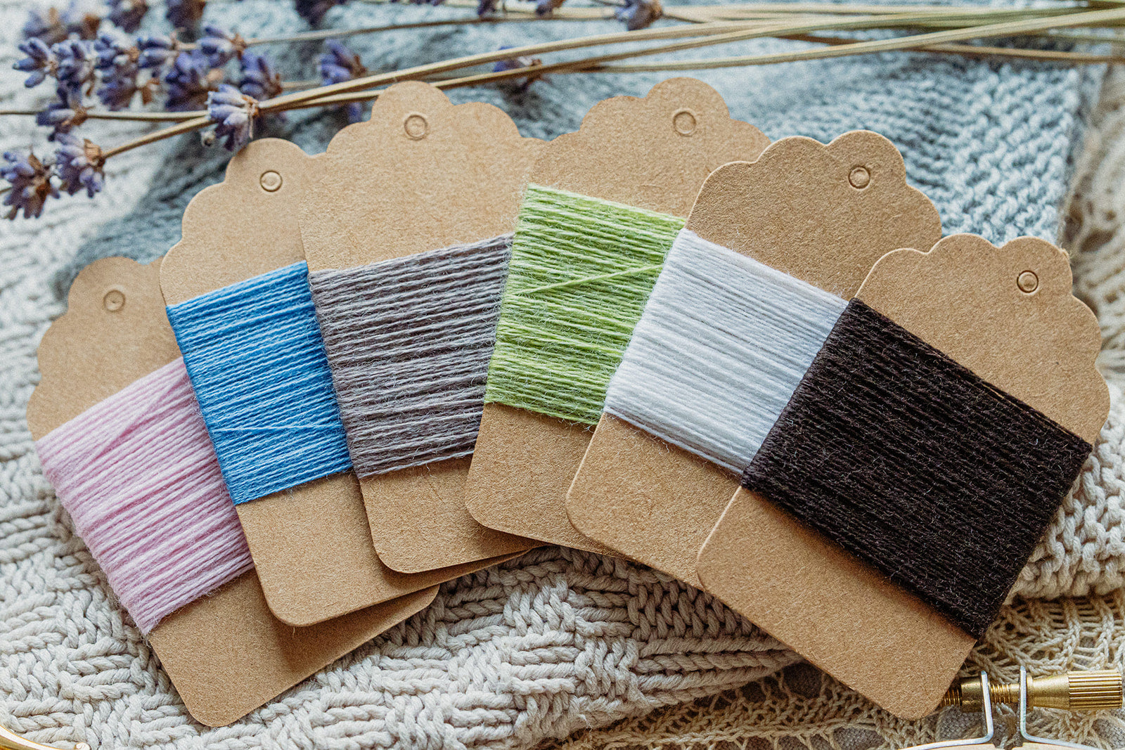 Du erhältst 6 verschiedene Garnfarben, die alle handgewickelt auf kleinen Garnkarten verschickt werden.