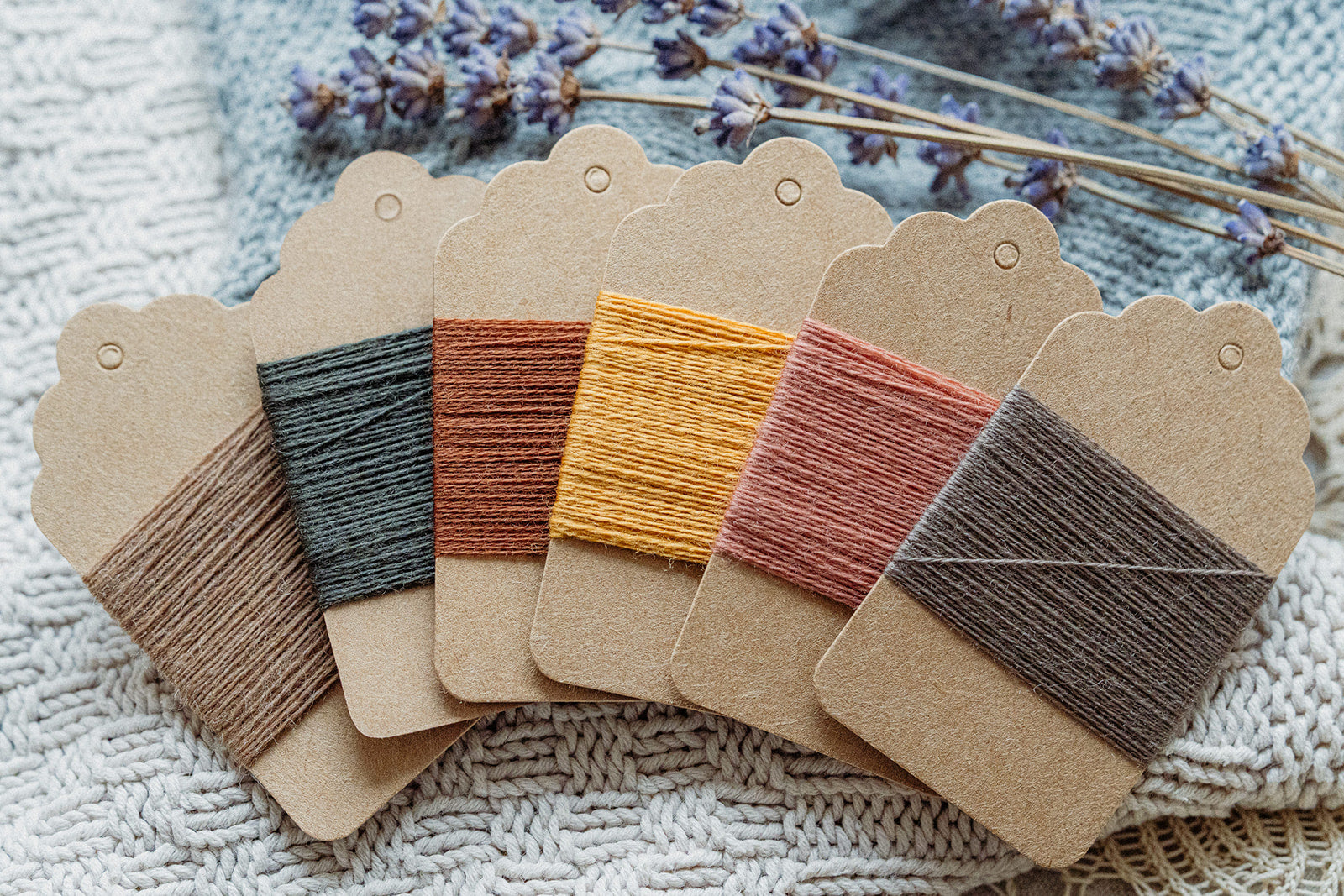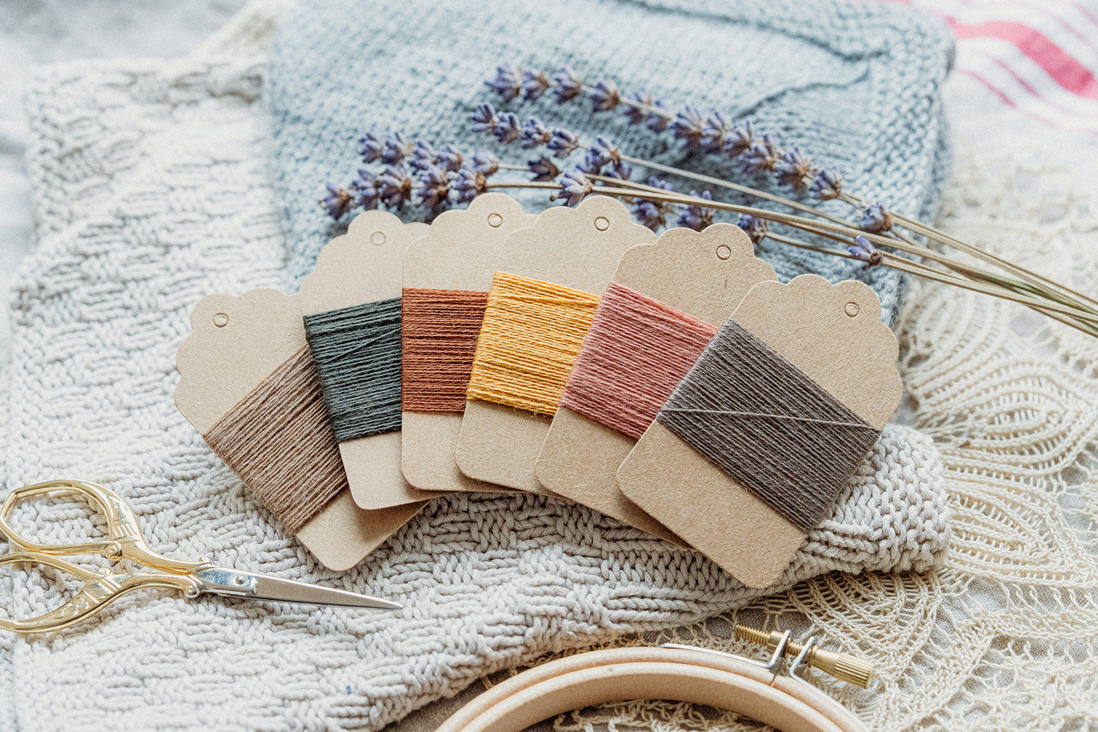 Du erhältst 6 verschiedene Garnfarben, die alle handgewickelt auf kleinen Garnkarten verschickt werden.