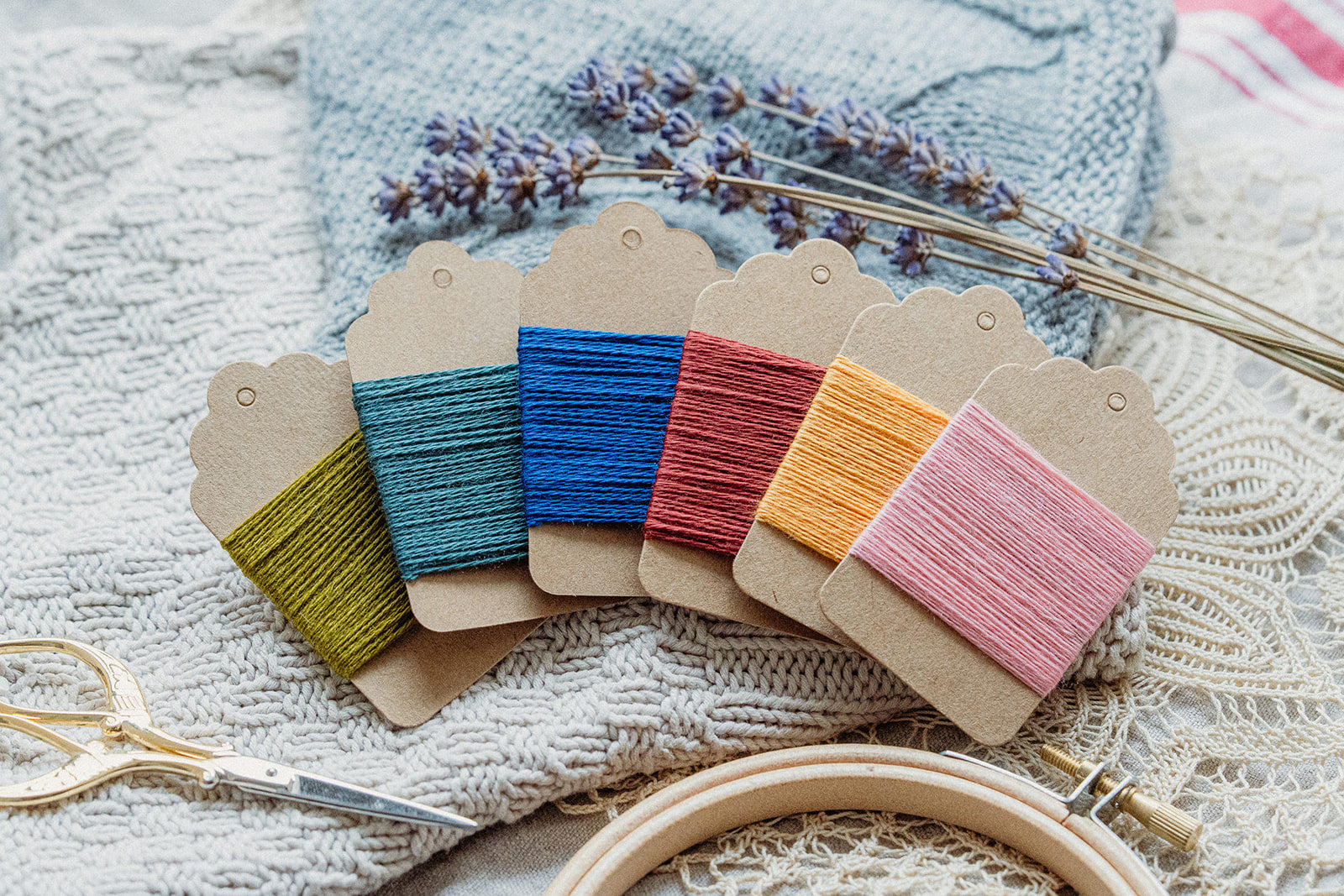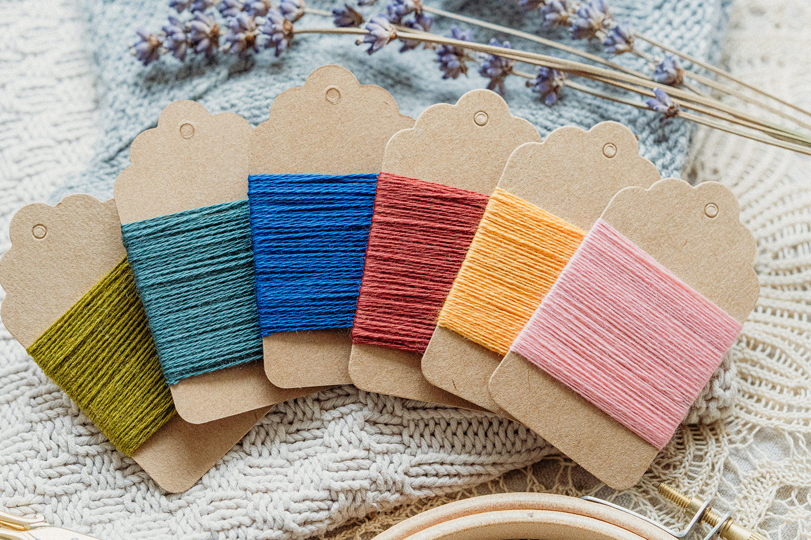 Du erhältst 6 verschiedene Garnfarben, die alle handgewickelt auf kleinen Garnkarten verschickt werden.