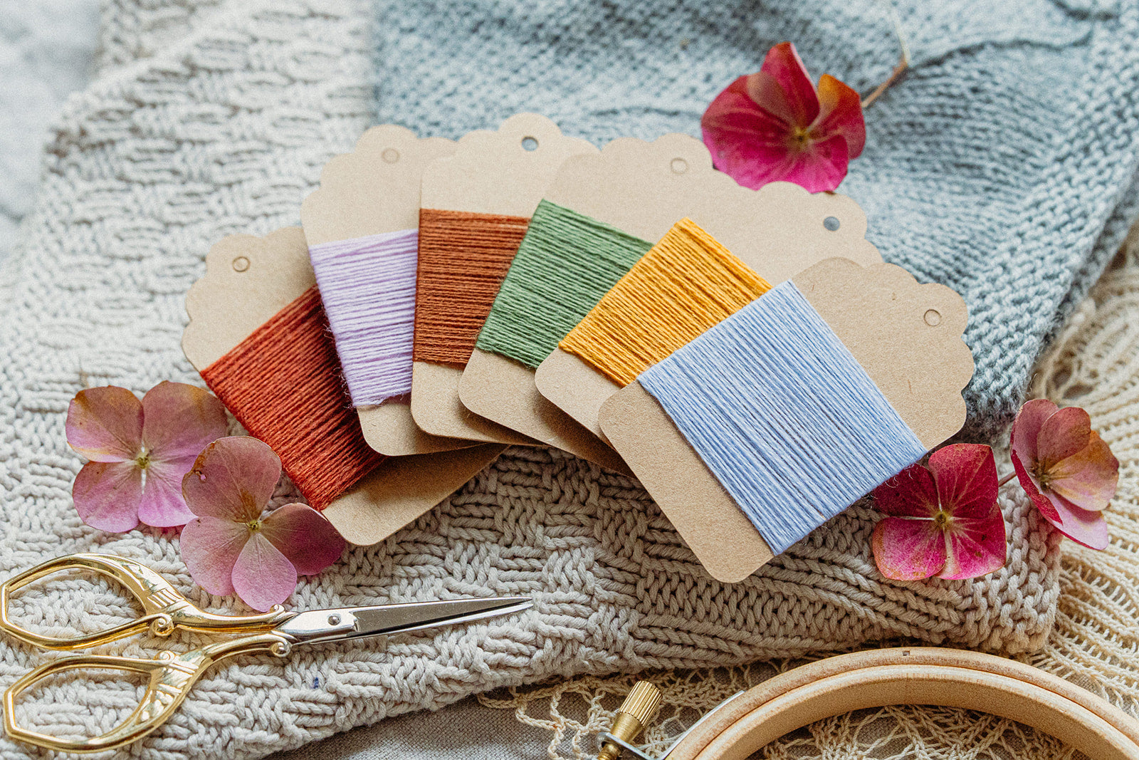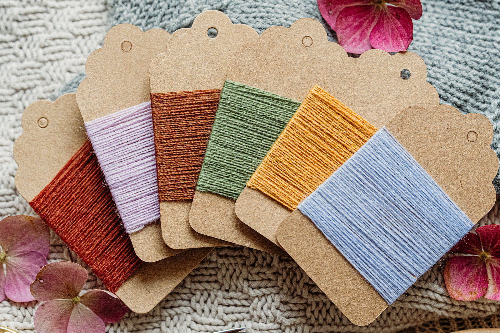 Du erhältst 6 verschiedene Garnfarben, die alle handgewickelt auf kleinen Garnkarten verschickt werden.