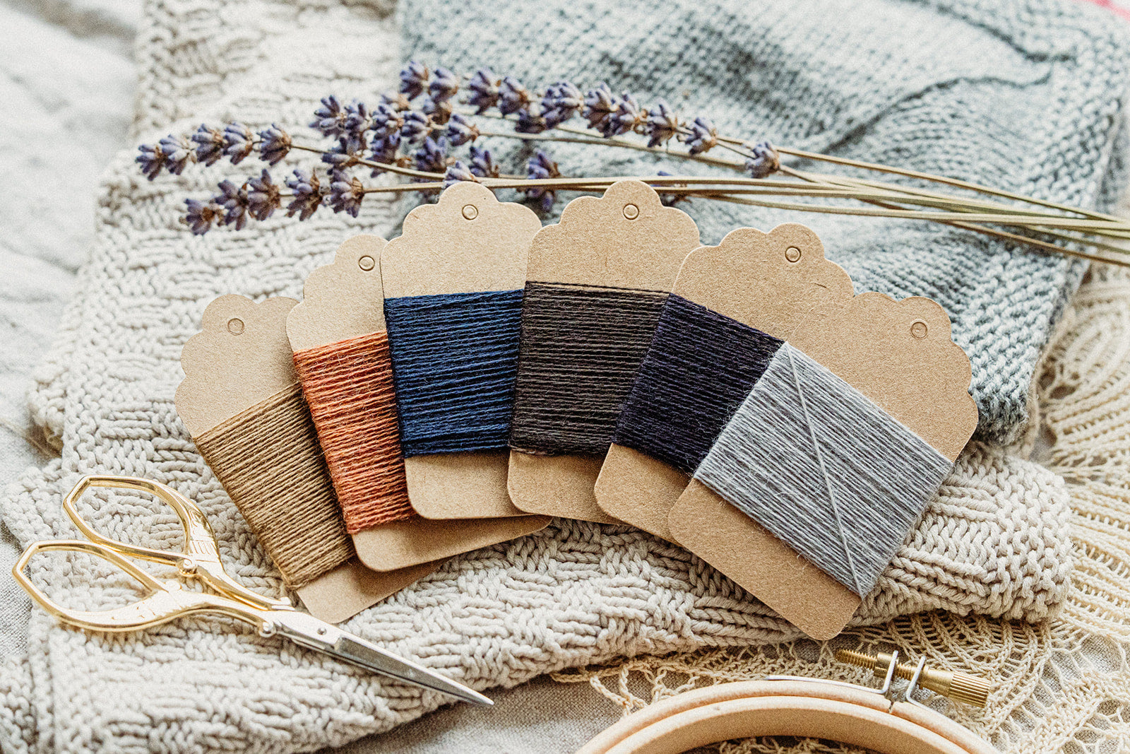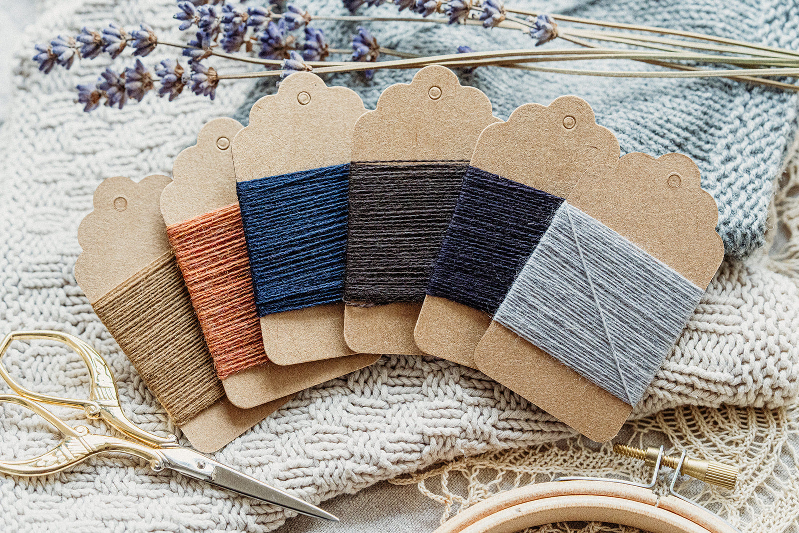 Du erhältst 6 verschiedene Garnfarben, die alle handgewickelt auf kleinen Garnkarten verschickt werden.
