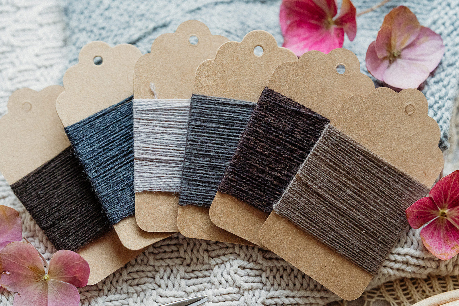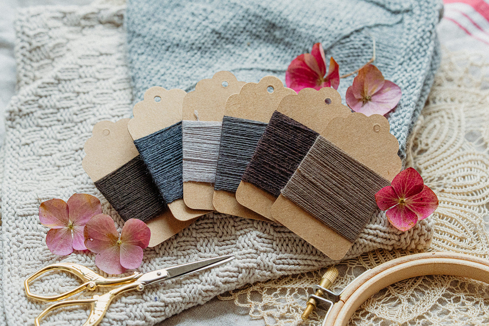 Du erhältst 6 verschiedene Garnfarben, die alle handgewickelt auf kleinen Garnkarten verschickt werden.