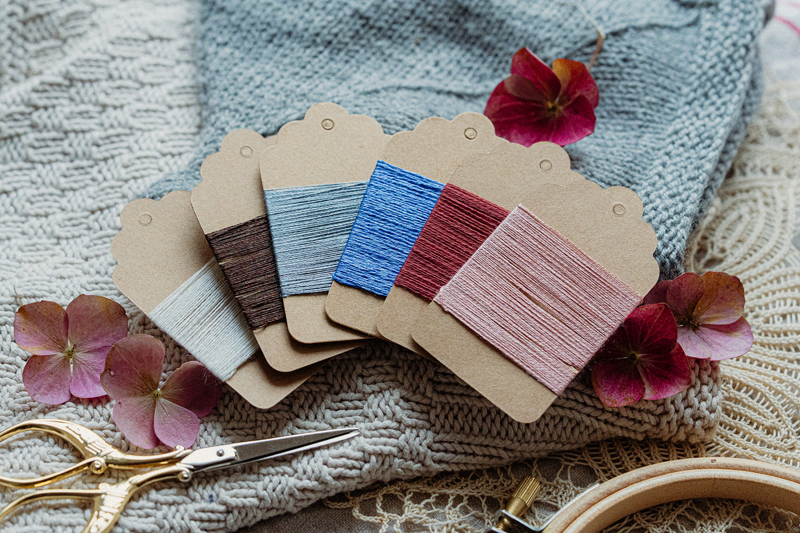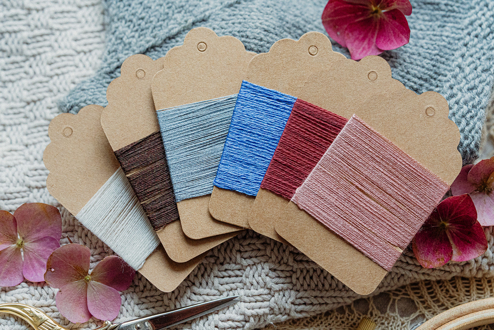 Du erhältst verschiedene Garnfarben, die alle handgewickelt auf kleinen Garnkarten verschickt werden.
